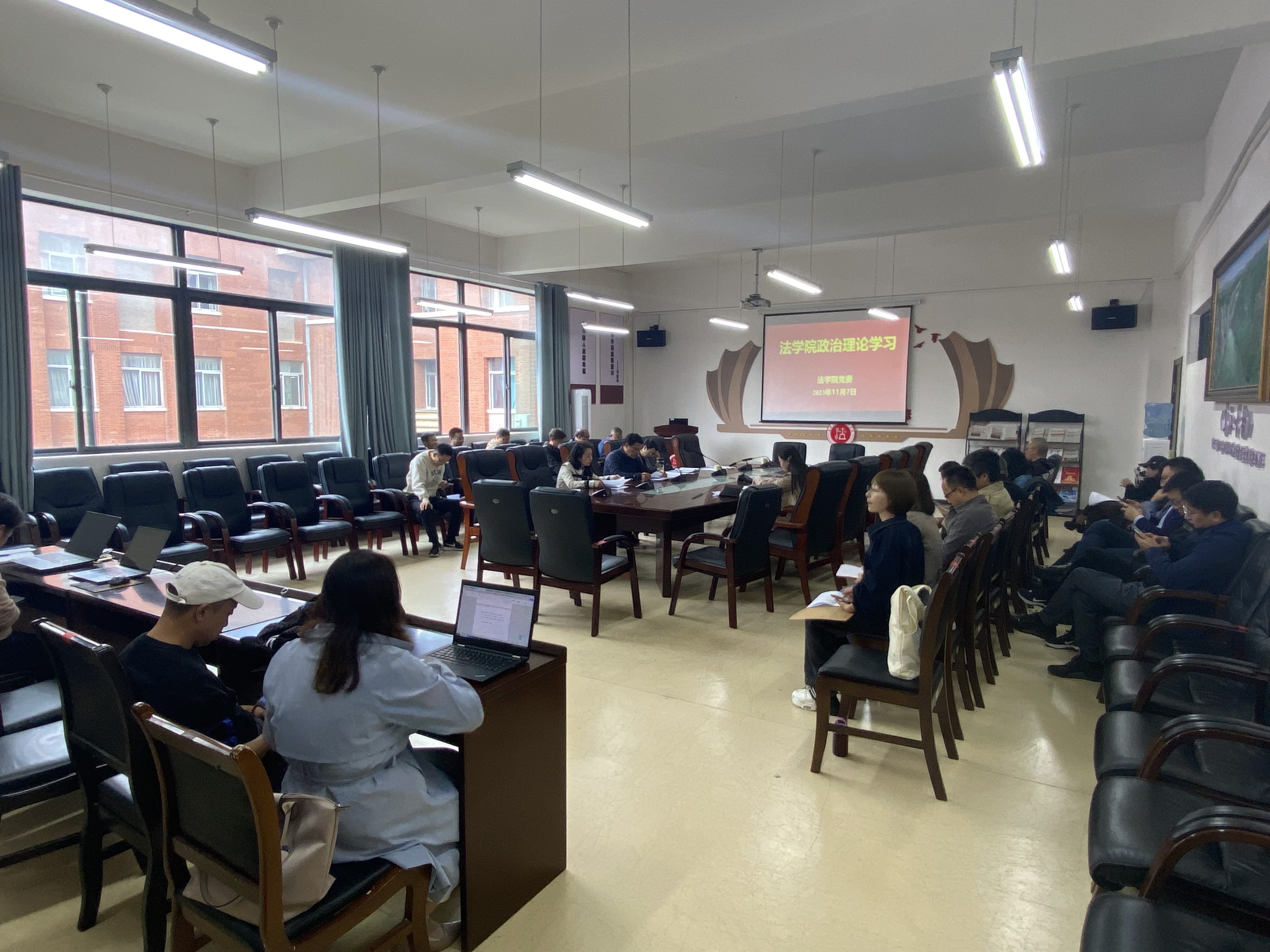 (法学院 向涛 报道|摄影 )11月7日,法学院党委组织召开2023年度第十六次教职工政治理论学习,此次会议的主题为“学习领会‘两个确立’的决定性意义,贯彻落实全省高等教育高质量发展大会精神,加快推动法学教育高质量发展暨师德师风建设”。包括全院领导在内的全体教职工出席会议,会议由党委书记詹伟主持。