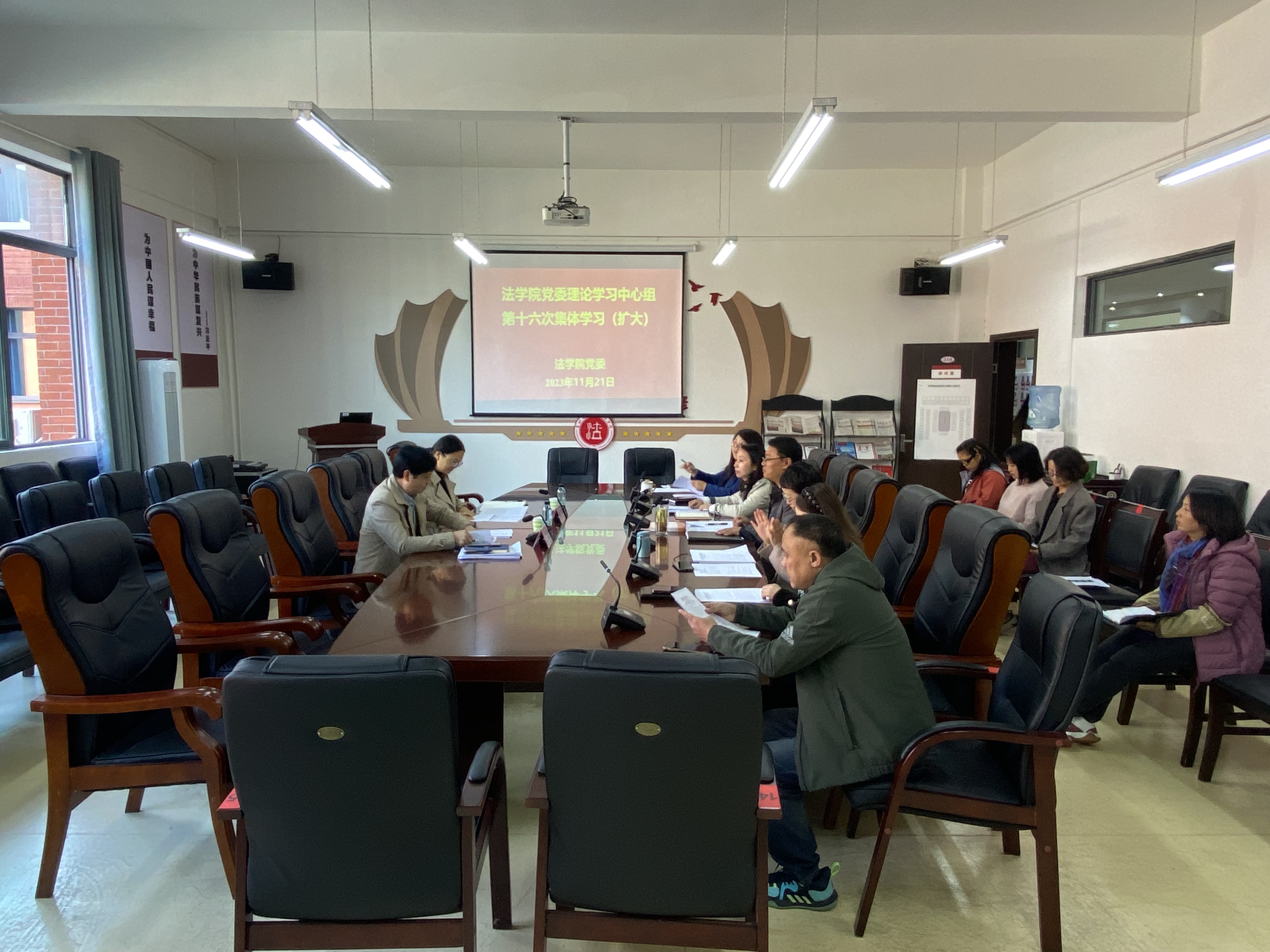 (法学院 向涛 报道|摄影 )11月21日,法学院党委理论学习中心组举行2023年度第十六次集体学习(扩大)研讨会。院领导、科级干部及党支部书记参加会议,院党委书记詹伟主持会议。