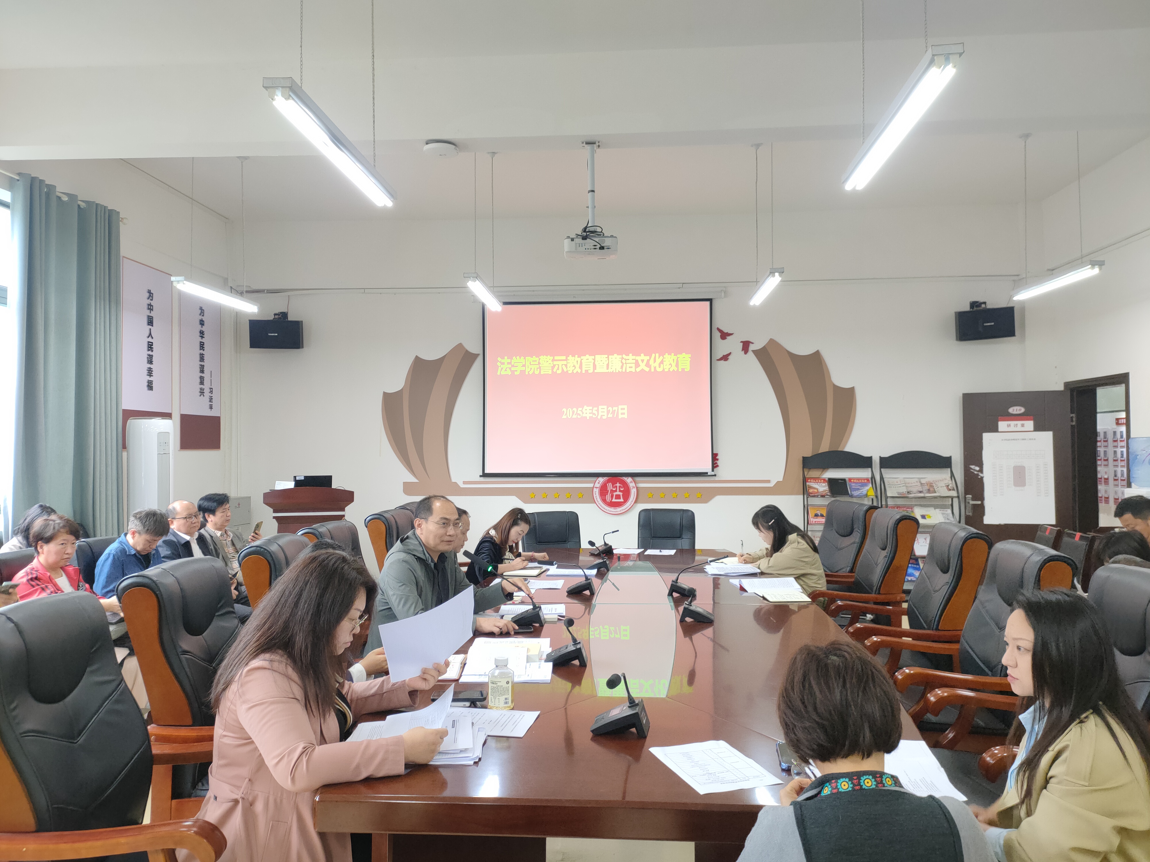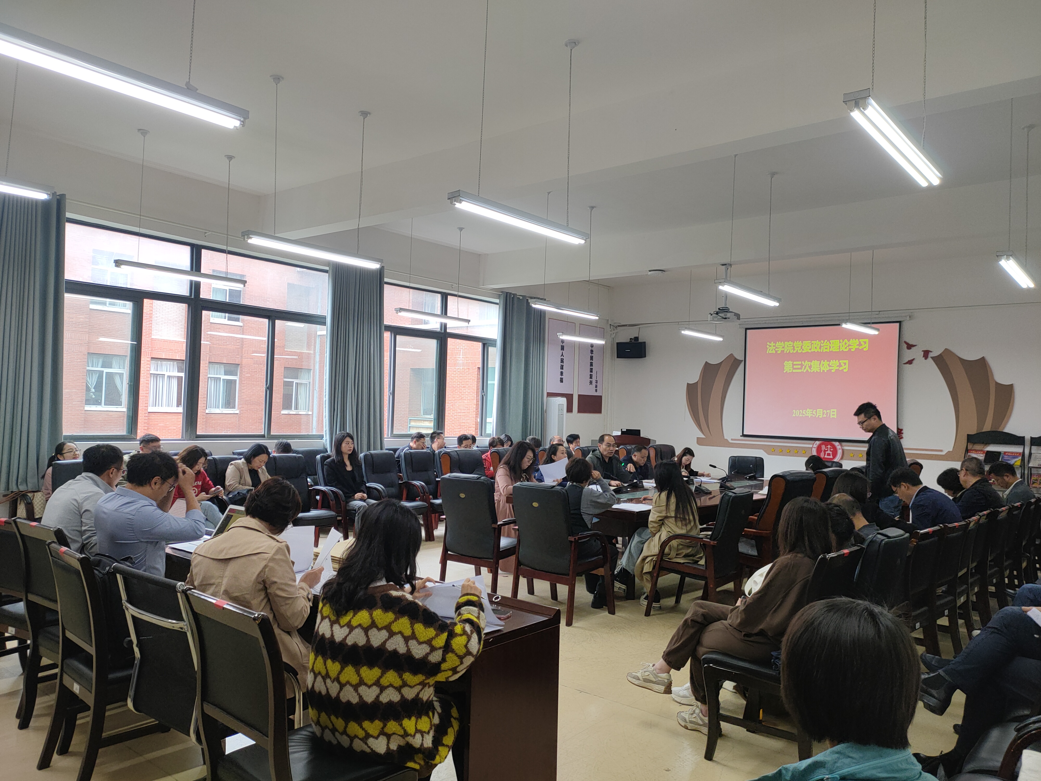 (法学院 潘吉脉 报道摄影 )5月27日下午,法学院党委组织召开2025年度第三次教职工政治理论集体学习,学院领导班子及全院教职工出席会议。党委书记邵新顺主持会议。