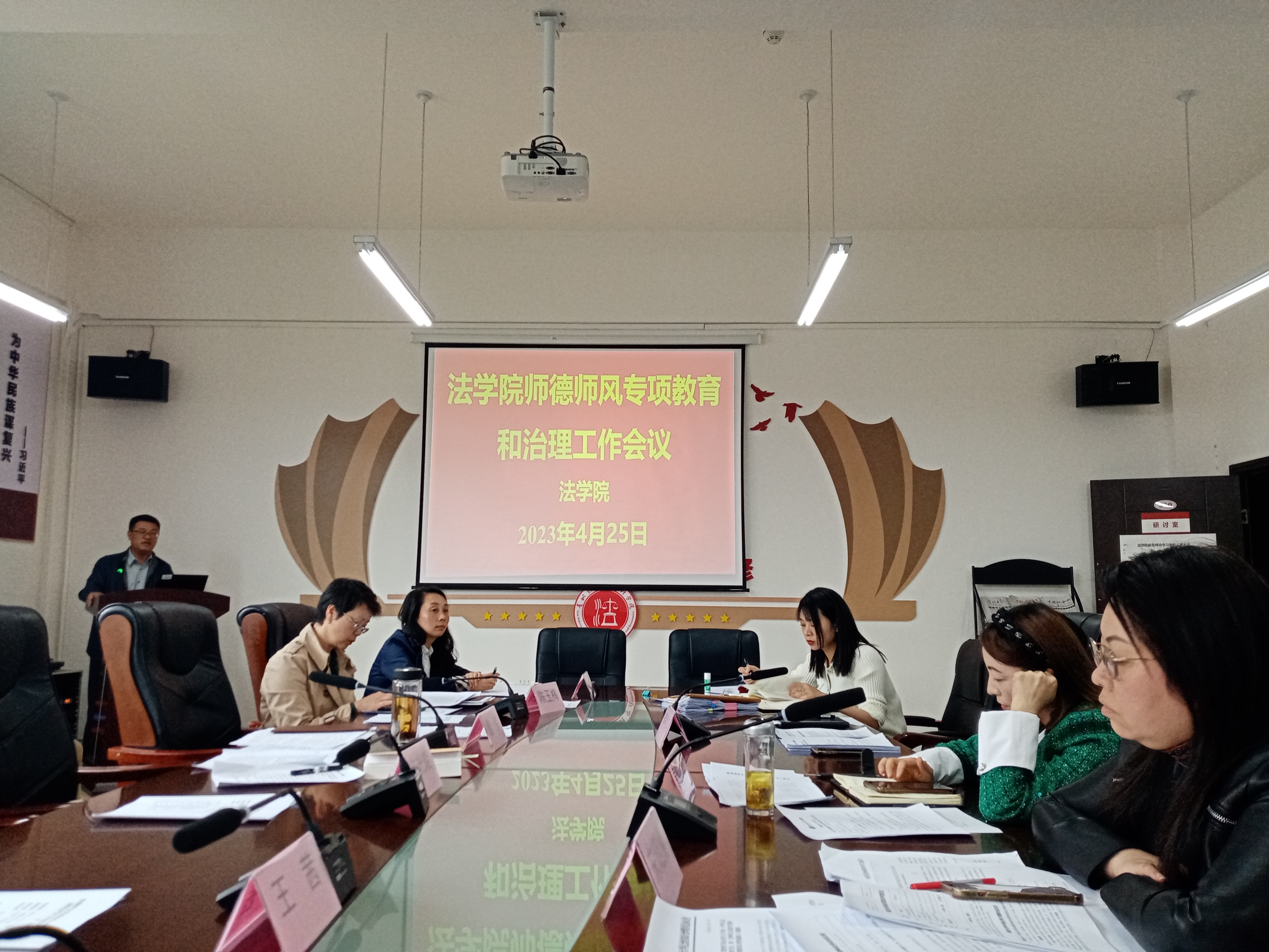 (法学院 图文/报道 徐方)4月25日上午,法学院在文德楼A8-310会议室召开师德师风专项教育和治理工作会议,院领导及全院教职工出席会议,院党委书记詹伟主持会议。
