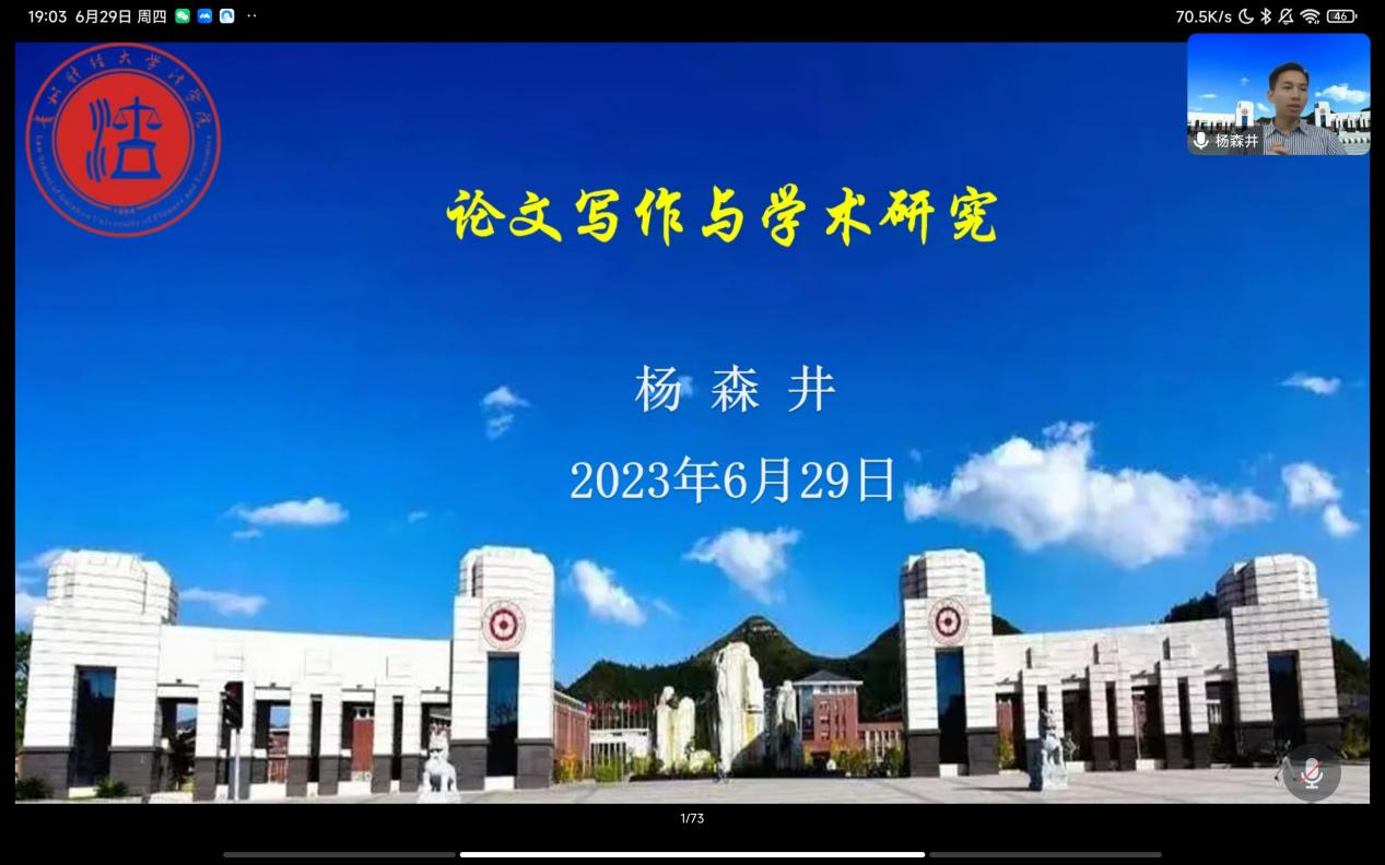 (法学院 图文/报道 田露丹)为解答学生对于论文写作的疑惑,2023年6月29日,联系研究生第一党支部的法学院党委委员、副院长宋昭澜邀请杨森井博士为党支部全体党员做“论文写作与学术研究”专题讲座,本次讲座通过线上腾讯会议的方式举行。