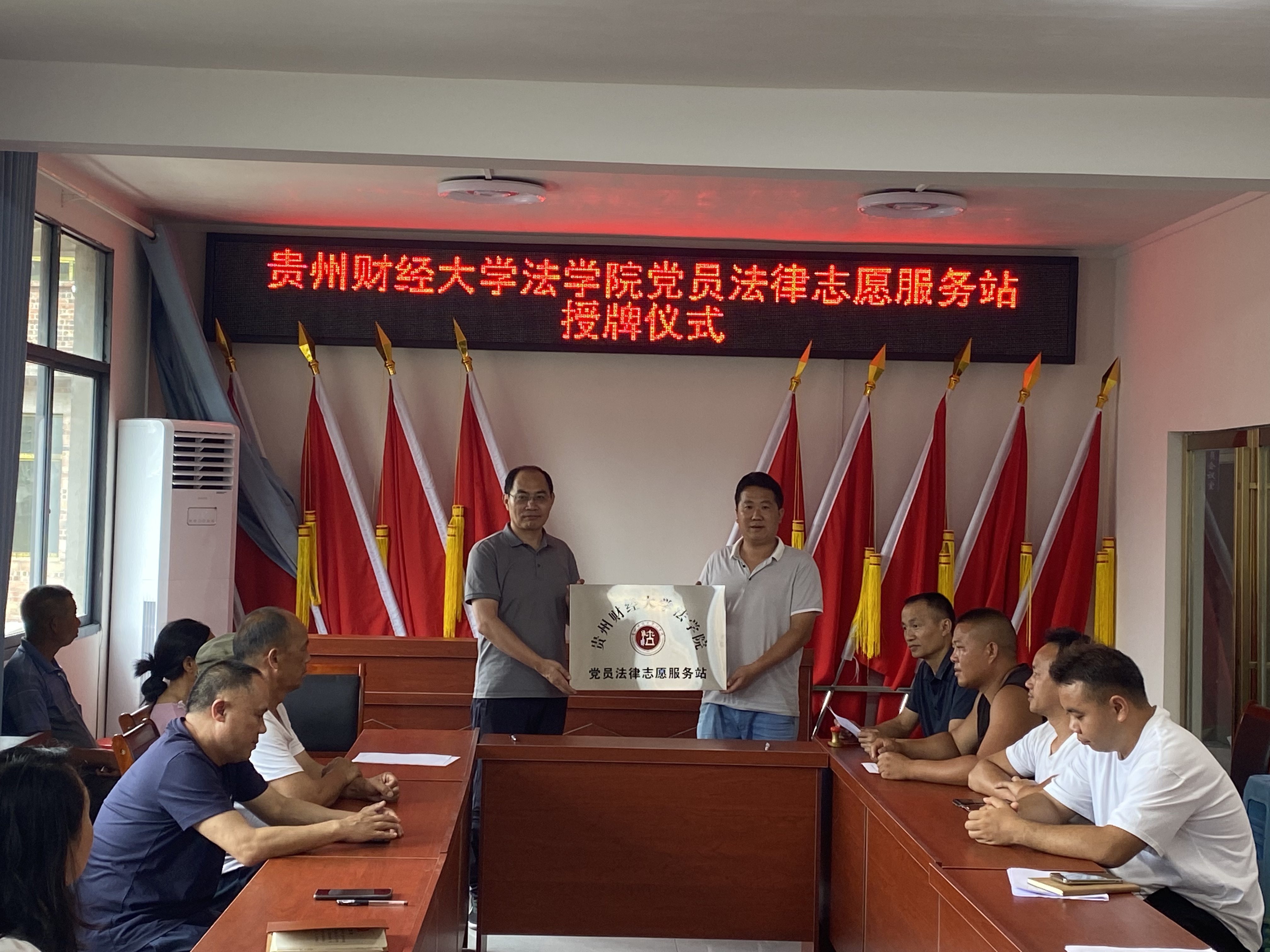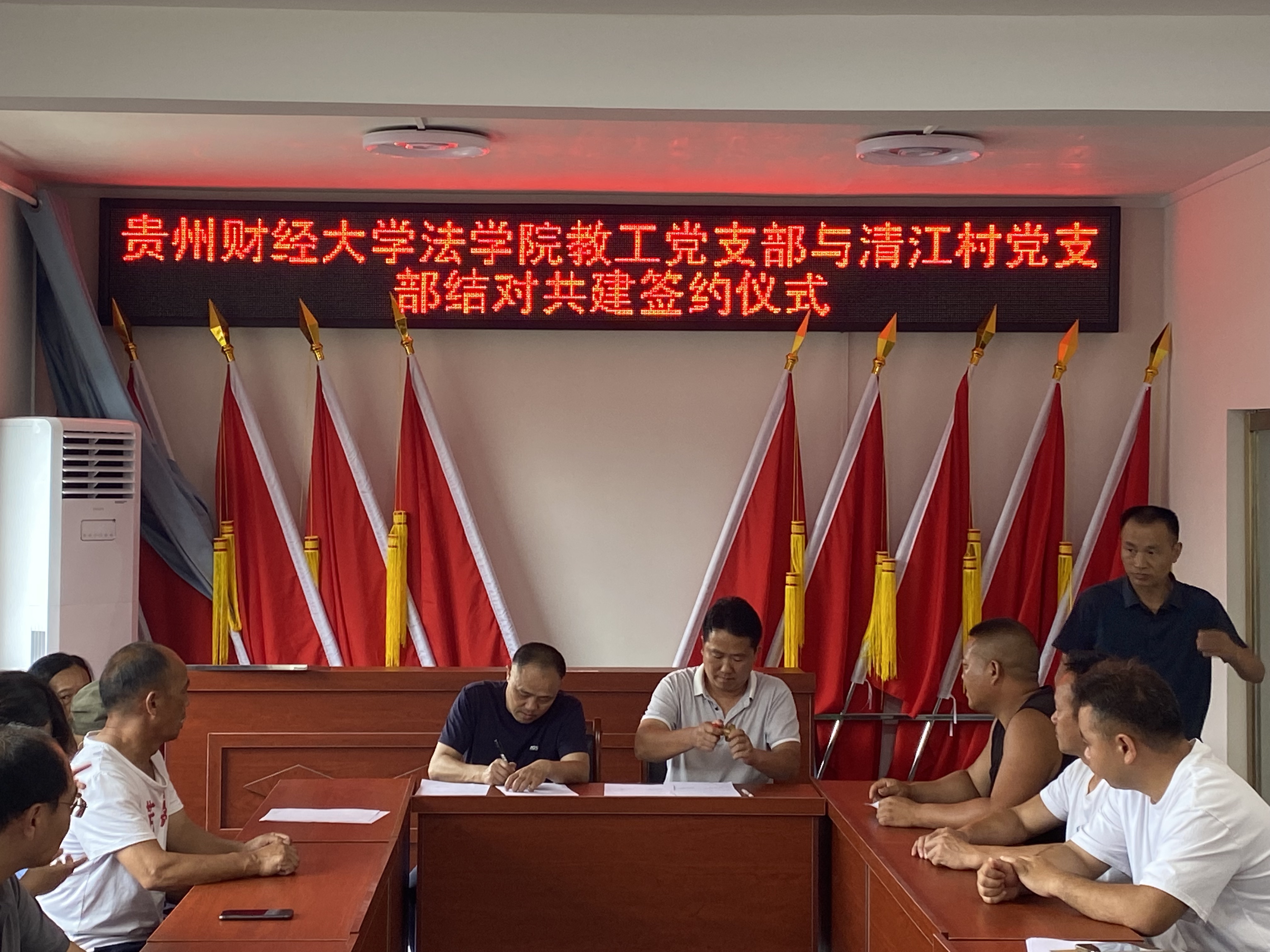 活动伊始,法学院党委与清江村村支两委、包括我院驻清江村第一书记李玉兰在内的驻村工作队开展座谈。清江村村支书陈世刚对法学院的到来表示欢迎,他介绍了清江村的村情民情等基本情况,希望法学院在民宿开发、苗族传统文化研学展销基地打造等方面给予支持。邵新顺表示将强化党建引领,与清江村党支部建立结对共建机制,发挥各自优势双向赋能,同时发挥法学院智力优势,为清江村的乡村振兴工作提供新思路、新方法。随后邵新顺与陈世刚共同为YABO.COM党员法律志愿服务站挂牌。曹务坤和陈世刚则围绕村民比较关心的婚姻家庭问题开展了题为《守护家庭权益 助力乡村振兴》的理论宣传二人讲,并现场回答了村民的相关困惑。曹务坤作为法学院教工第二党支部书记与陈世刚签署了党支部结对共建协议,两个支部将在支部建设、产业发展、法律援助与调解等方面开展合作。