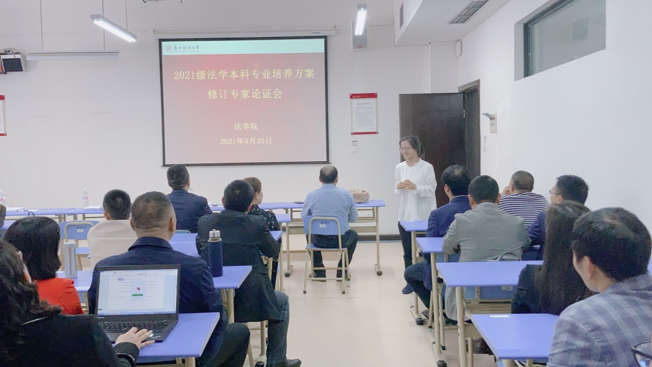 (图 张瑞华/文 李玉兰)2021年5月26日上午,我院在励学楼206举行了2021级法学本科专业培养方案修订的专家论证会。贵州大学法学院副院长、博士研究生导师宁立标教授,贵州民族大学博士研究生导师陈小平教授、杨军教授、潘善斌教授以及贵州师范大学法学院文永辉教授、贵州师范学院金凤教授等13个校外专家进行了现场论证,我院曹务坤、胡甲庆、刘云飞等老师参加了会议,会议由学科办负责人李玉兰主持。