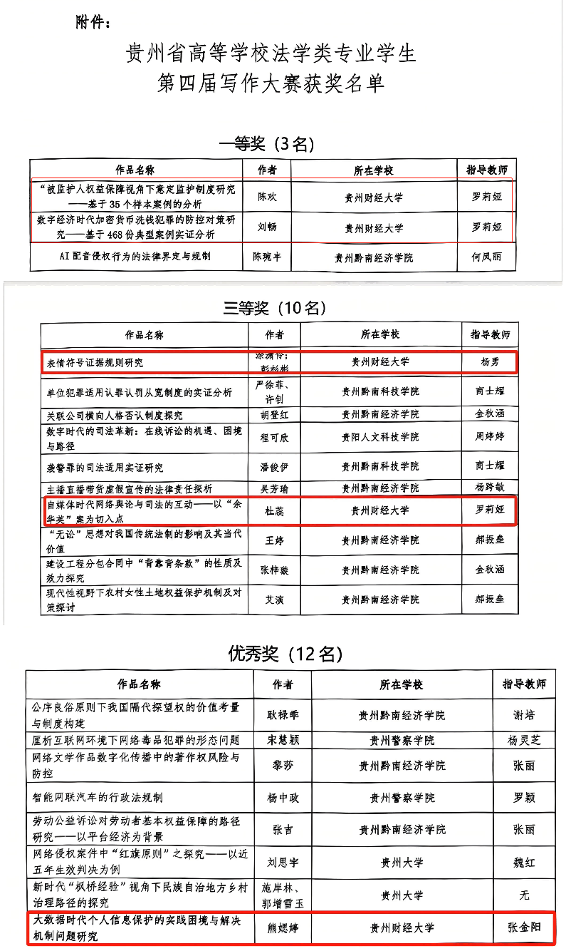 YABO.COM法学院学子在贵州省高等学校法学类专业学生第四届写作大赛斩获佳绩