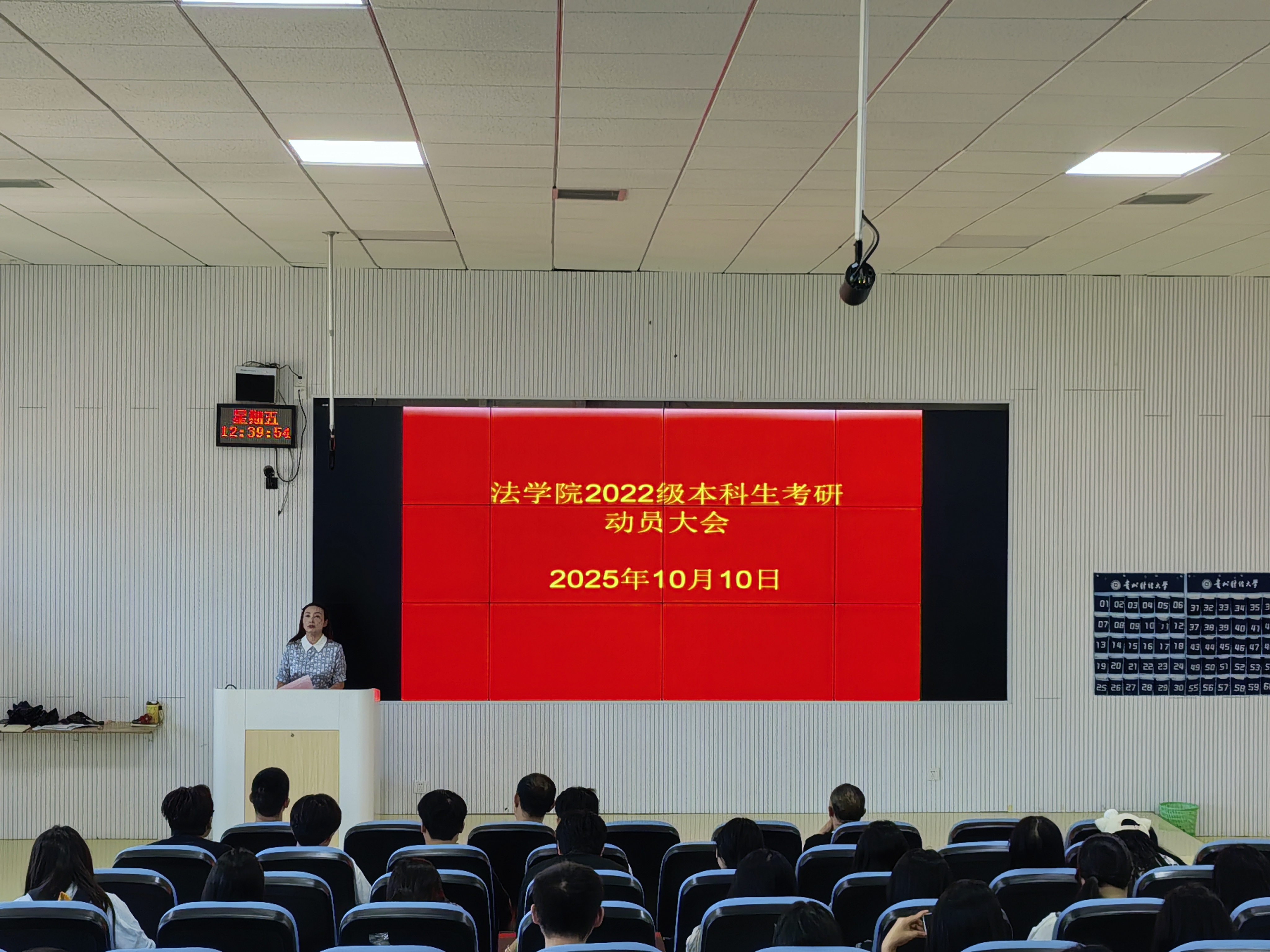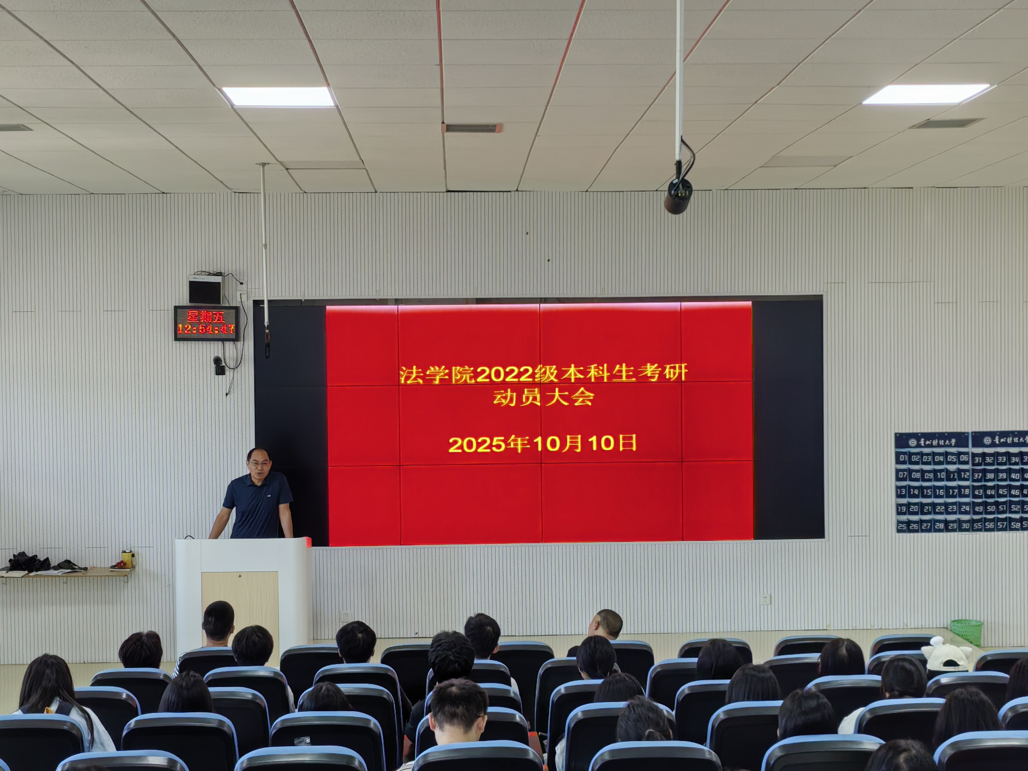 (法学院 潘吉脉 报道、摄影)为帮助2022级本科生明确考研目标、把握备考方向,凝聚考研信心与力量,10月11日,我院22级本科生考研动员大会在乐学楼201召开。院党委书记邵新顺、副院长(主持工作)曹务坤、副书记彭华、辅导员潘吉脉及2022级全体本科生参加会议,会议围绕考研政策解读、备考规划指导与思想动员展开,为即将踏上考研征程的学子们注入强劲动力。