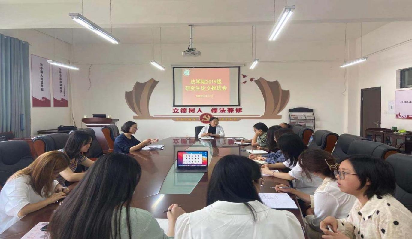 2021年9月7日上午,法学院在文德楼A8-310会议室召开了2019级硕士研究生学位论文工作推进会。本次会议由法学院副院长(正处级、主持工作)陈玉梅主持,硕士研究生导师曹务坤、胡甲庆等以及学科办魏晓瑞、研究生辅导员杨兴莉及2019级硕士研究生参会。