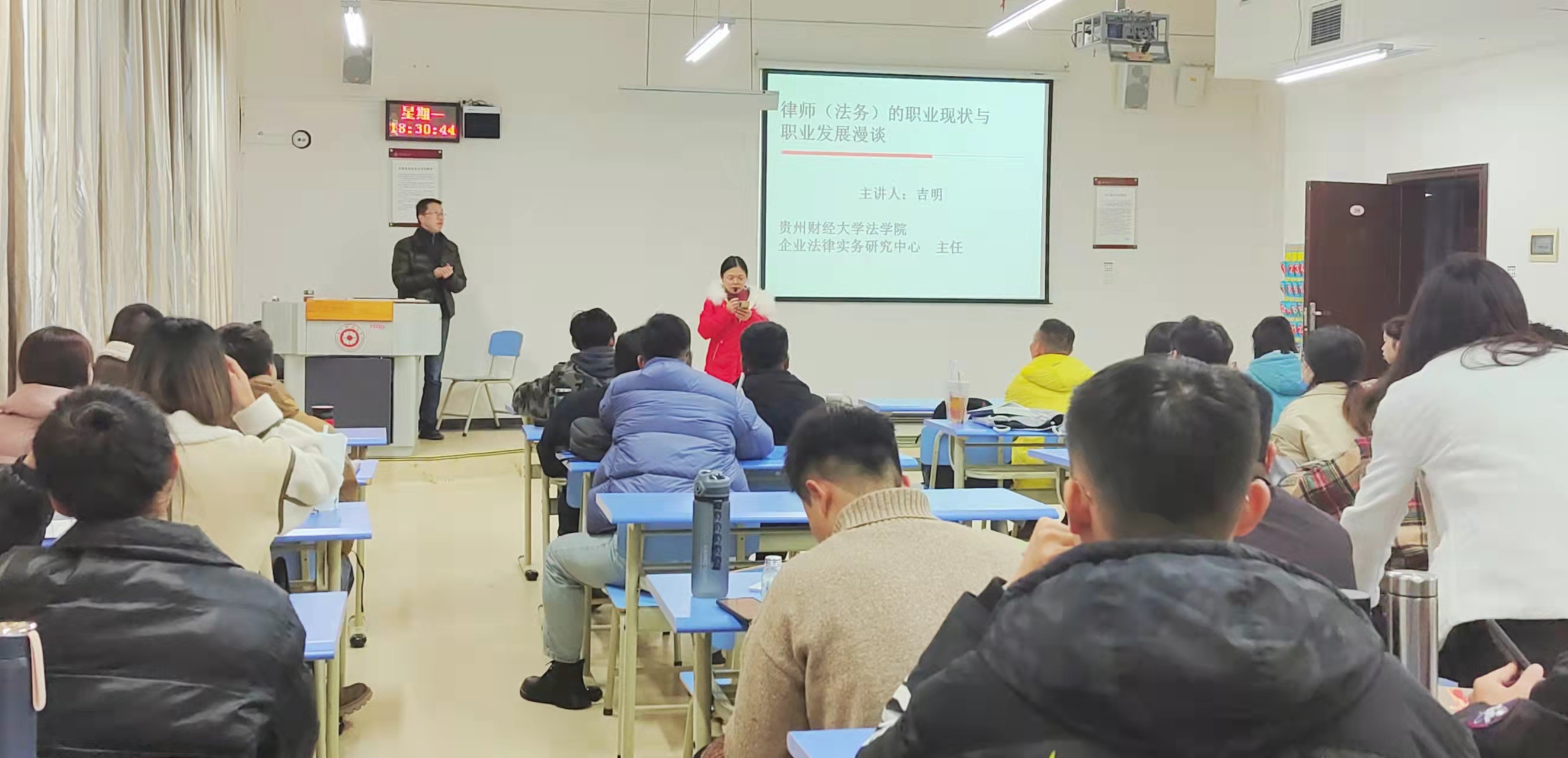 (法学院 黄晨旭 报道/摄影 肖文西)2021年11月29日,法学院在励学楼208教室举办法商论坛系列讲座之《律师(法务)的职业现状与职业发展漫谈》。此次讲座由贵州财经大学企业法律实务中心主任、执业律师吉明老师主讲,法学院60余名研究生到场聆听。