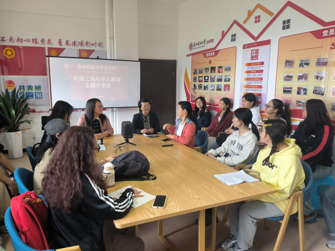 (法学院 张云舒 闫康豪 报道|摄影 ) 为落实立德树人根本任务,扎实推进学风建设,增强学生学习积极性和主动性,营造良好的学习氛围,2024年6月4日下午,由法学院研究生会主办的“考博之路与学风教育”主题分享会在法学院“一站式”学生社区——玉兰苑1栋433党团活动室举行,法学院党委副书记、院长陈玉梅,副院长宋昭澜、辅导员杨兴莉及各年级研究生代表参会。会议由杨兴莉主持。