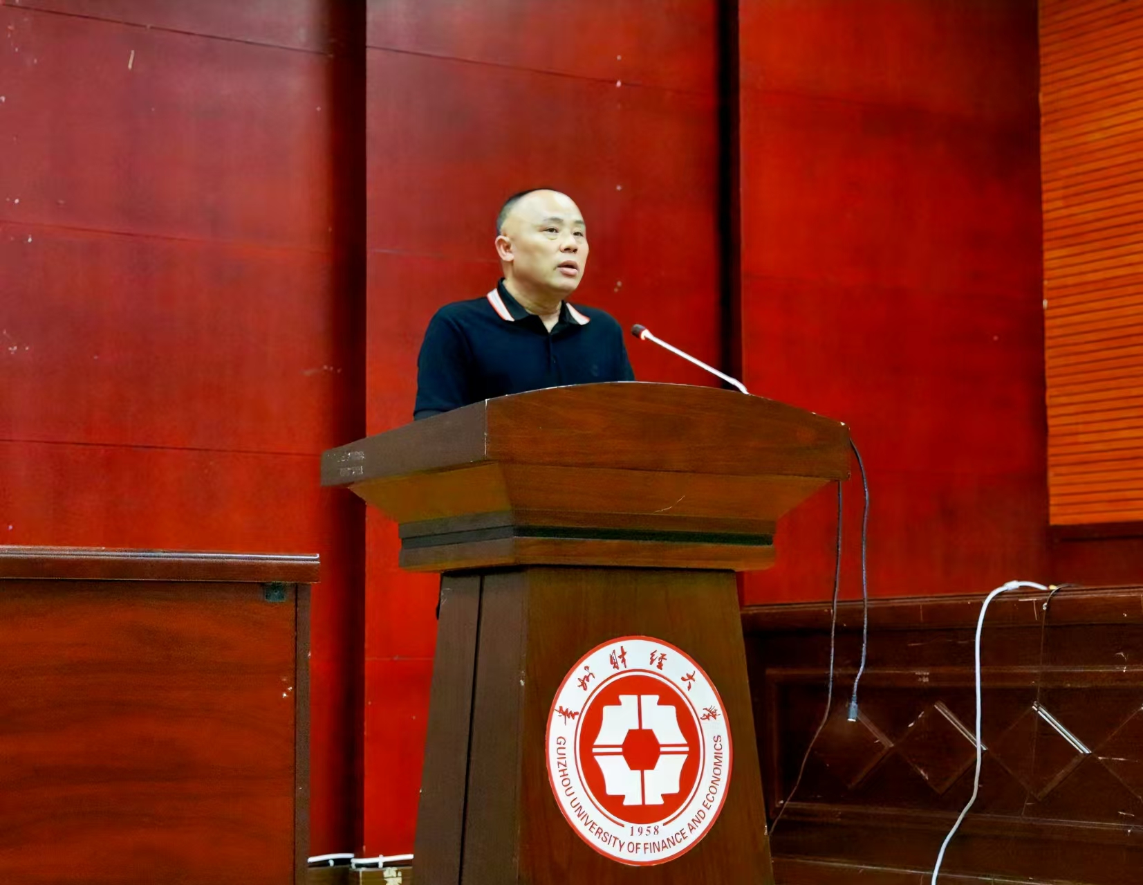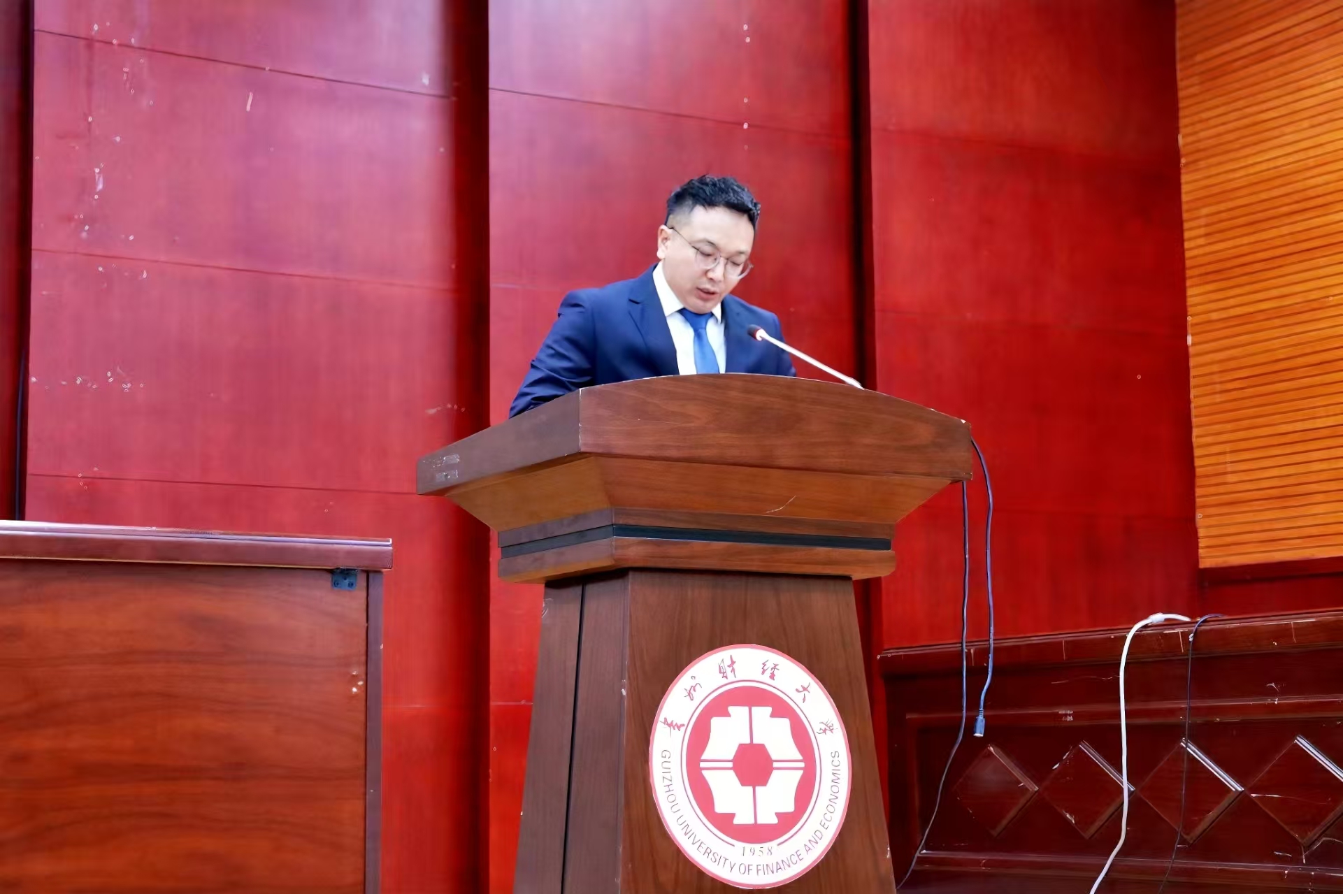典礼伊始,曹务坤首先代表学院致辞。他围绕“学院发展历程”与“法学专业时代价值”两大核心展开,既简要梳理了学院在法学教育领域的办学积累,也结合当下法治社会建设的大背景,解读了法学专业的现实意义与学习方向,为新生阐明“为何学法、学什么法”的基础认知。