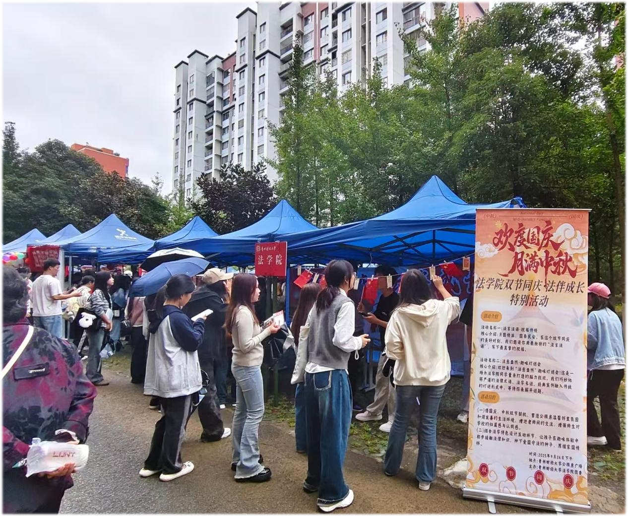(法学院 马先美 报道|摄影 杨庆萱)金秋送爽,丹桂飘香,在中秋与国庆双节来临之际,为丰富师生的校园文化生活,营造浓厚的节日氛围,同时深化法学专业素养,法学院于9月26日在公租房广场成功举办“双节同庆,法伴成长”主题活动。本次活动涵盖“法言法语·祝福传情”“法意盎然·趣味灯谜会”两大特色环节,吸引了校院数百名师生积极参与,现场欢声笑语不断,洋溢着温馨祥和的节日气息。