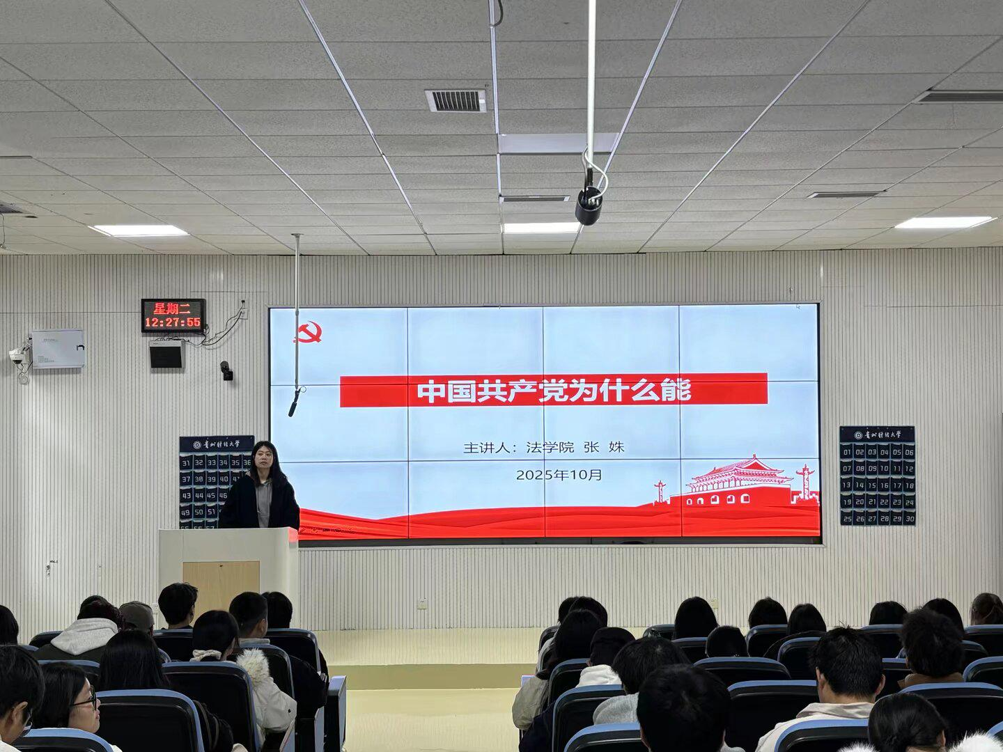 法学院学科办副主任张姝主讲了“中国共产党为什么能”的专题团课。张姝围绕党的百年奋斗历程与时代价值,结合法治领域的实践案例,生动阐释了中国共产党带领人民取得伟大成就的核心密码,引导在场师生深刻认识党的先进性与凝聚力。