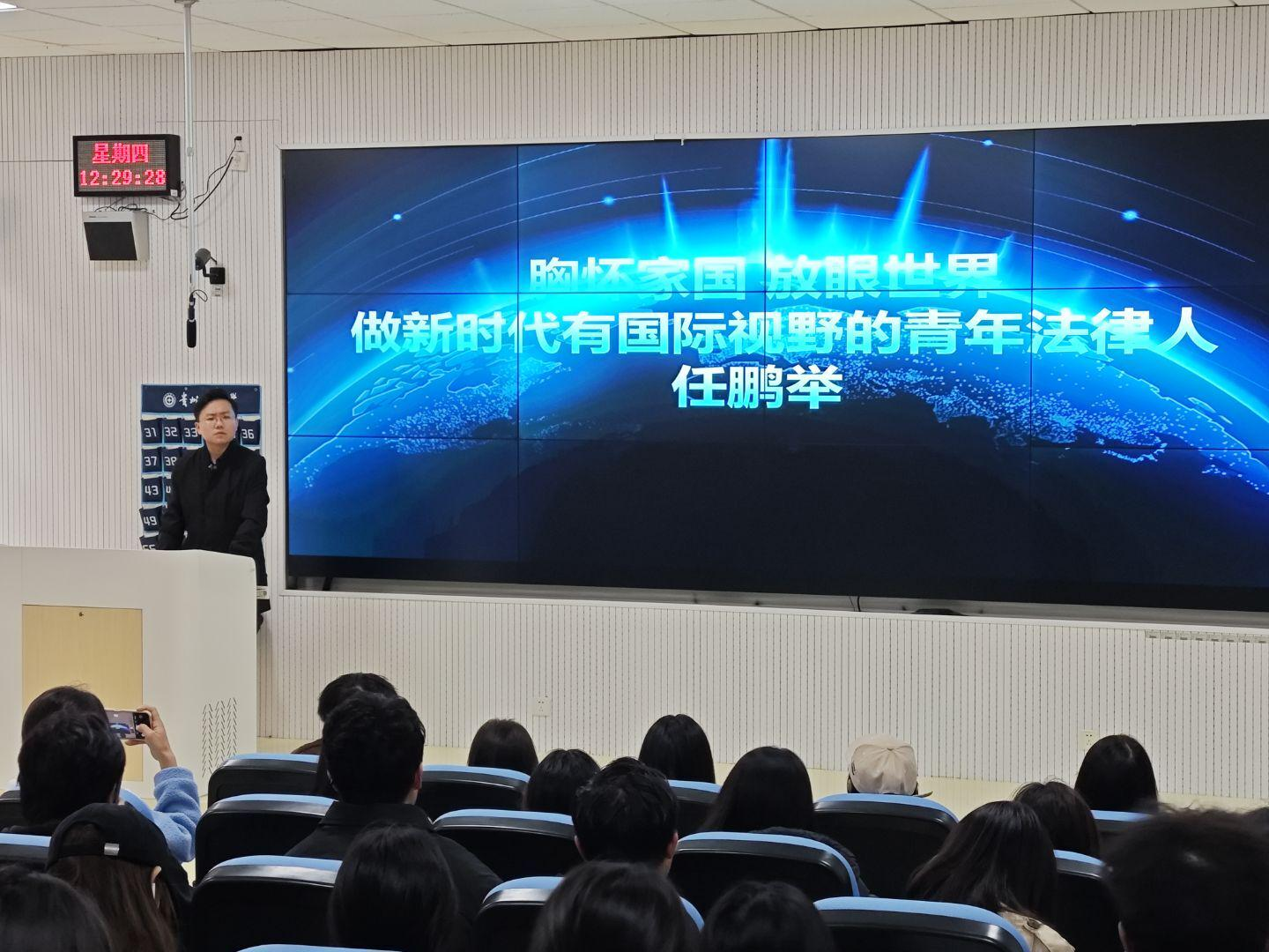 法学院关工委青年教师委员、副教授任鹏举聚焦“胸怀家国 放眼世界——做新时代有国际视野的青年法律人”,结合全球法治发展趋势与我国法治建设实践,引导学生思考。任鹏举通过典型案例分享,从“涉外法律实务”“乡村振兴中的法治服务”等维度,阐释了法学青年“立足本土、面向世界”的责任路径。