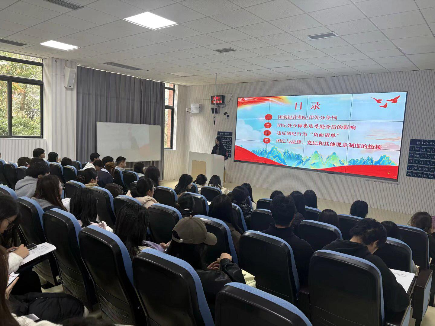 法学院团委负责人刘美伶主讲"中国共产主义青年团纪律处分条例",围绕《团的纪律和纪律处分条例》展开讲解,清晰梳理了团纪处分的种类、受处分后的影响,明确了违反团纪行为的“负面清单”,同时阐释了团纪与法律、党纪及其他规章制度的衔接要求。