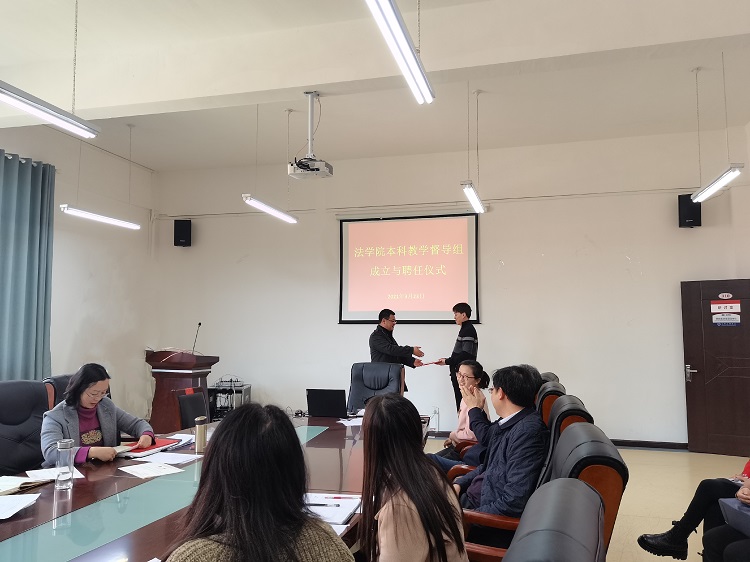 为全面贯彻党和国家的教育方针,进一步提高本科教学水平,加强、保障本科教学质量,法学院依据相关规定并结合学院实际,制定了《法学院本科教学指导委员会暂行办法》、《法学院本科教学督导管理规定(试行)》和《法学院本科教学督导委员会实施细则(试行)》,学院成立了以陈玉梅为主任委员的本科教学指导委员会、以曹务坤为组长的本科教学督导组,学院党委书记詹伟向各位委员颁发了聘任证书。陈玉梅、曹务坤两位教授作了表态发言,表示将带领本科教学指导委会委员、本科教学督导组成员一起认真履行工作职责,按时完成相关工作任务,为学院和学校的本科教学工作尽一份绵薄之力。