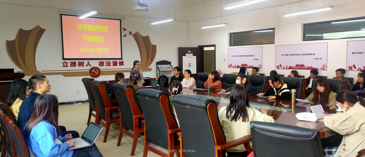 (法学院 图文/报道 粟振江)为解决法学院研究生工作的难点、重点,提升研究生干部的业务能力素养,2021年11月5日下午14时,法学院研究生干部培训在文德楼A8-310举行。法学院学科办李玉兰、辅导员杨兴莉出席,研究生各班级班委成员、各研究生支委和研究生会全体成员等40余人参训。