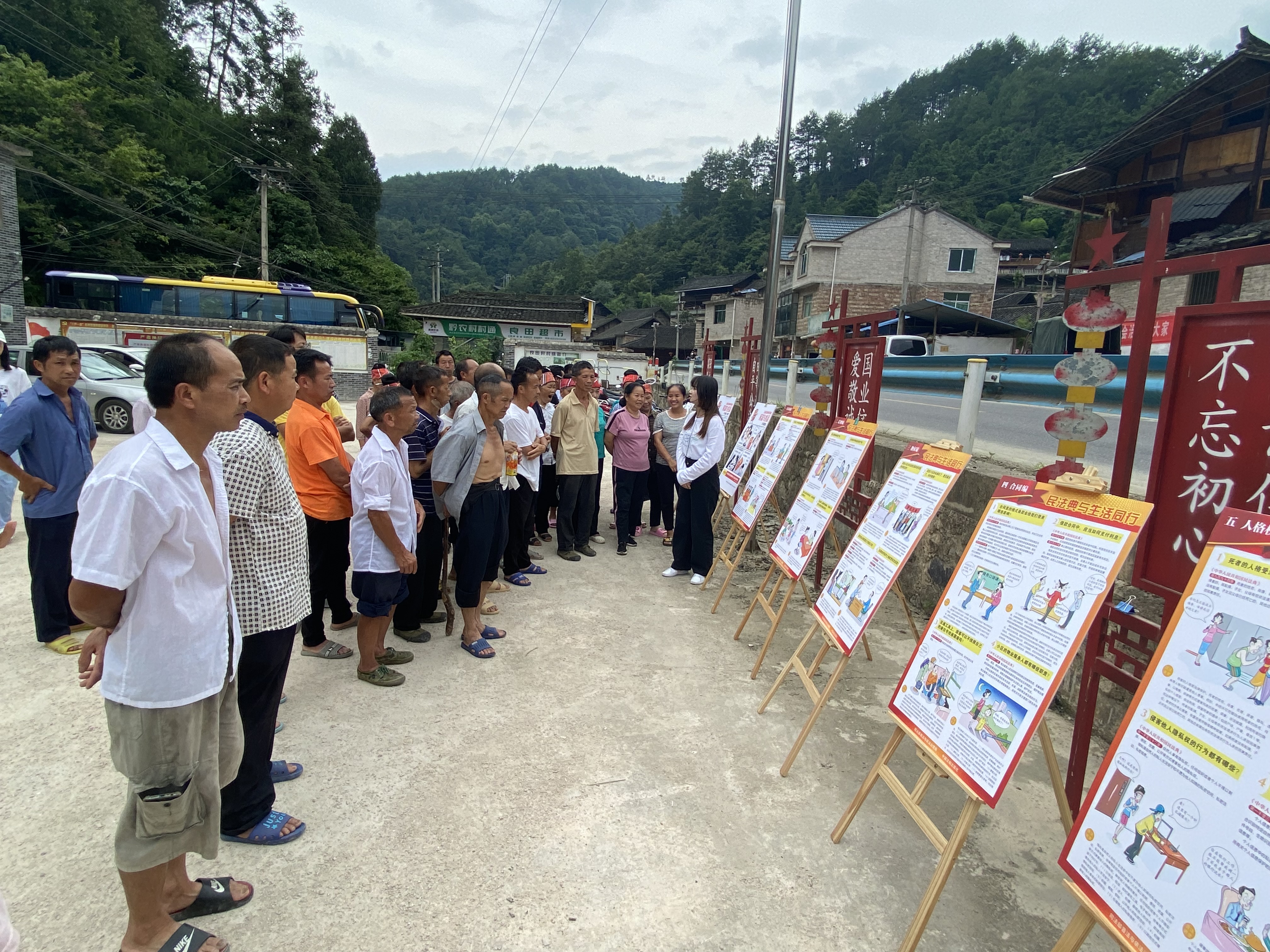 在良田村村委会,党委宣传部和法学院以“双语”即苗语和普通话及漫画展板的形式,向良田村村民宣传了宪法日的由来、意义,宪法对于国家发展、群众生活等各方面的影响,并围绕宪法关于农业农村农民的有关规定、乡村振兴促进法、农村土地承包法等涉农重点法律法规向村民们进行了讲解。宣讲完成之后,法学院党委与良田村村支两委、包括我院驻村干部王宏博士在内的驻村工作队进行了座谈,了解良田村在乡村振兴特别是产业发展中存在的问题,法学院党委书记詹伟,党委副书记、院长陈玉梅表示法学院将一如将往地和良田村村委一起,共商共享,同向发力,解决良田村在乡村振兴中存在的难点和痛点问题。