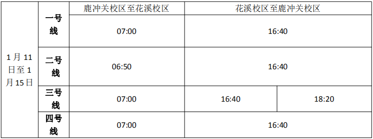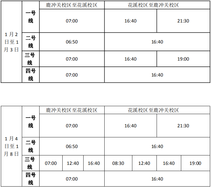 按照学校统一安排,YABO.COM鹿冲关校区、花溪校区进入期末考试阶段, 1月8日考试结束,为满足期末考试需要和行政科研工作的开展,现对交通车作如下调整:
