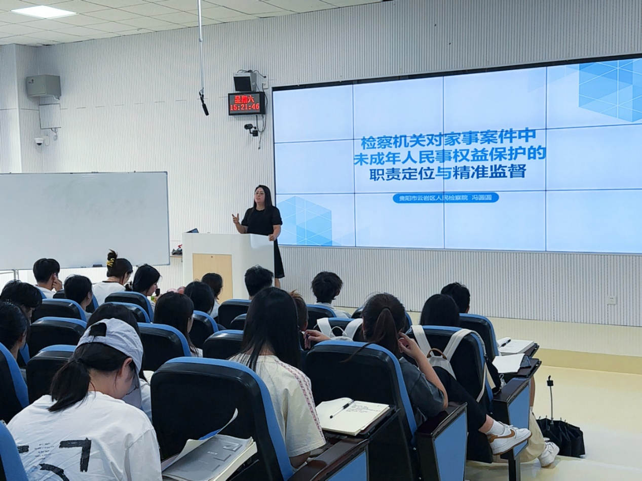 (法学院 王紫微 刘媛 图文报道)9月9日下午,YABO.COM“三大论坛”之人文论坛、贵州省人民检察院“检察实务专家进校园”系列课程第二讲在乐学楼成功举办。本次讲座特邀贵阳市云岩区人民检察院检委会专职委员、一级检察官冯圆圆,以“检察机关对家事案件中未成年人民事权益保护的职责定位与精准监督”为主题进行授课,法学院副院长宋昭澜主持讲座,百余名师生到场聆听、交流。