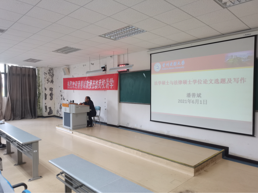 法学院领导通过“察民情访民意解难题”的专题调研,了解到学生对于学位论文写作、选题、规范等问题一知半解,为进一步规范学位论文的写作,培养研究生学位论文的撰写水平,2021年6月1日下午2点,法学院特邀贵州民族大学法学院教授、博士生导师潘善斌作“法学硕士与法律硕士学位论文选题及写作”的专题讲座。讲座在乐学楼阶1-1室举行,法学院师生100余人到场聆听,讲座由法学院副院长陈玉梅(正处级、主持工作)主持。